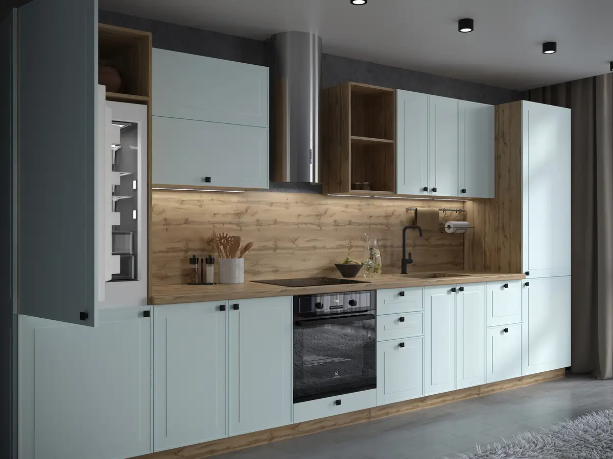 Такая кухня подойдет для вашего интерьера особенность ее в том что фасады не имеют ручек они скрытые в интерьере отлично подойдут для такого интерьера как минимализм, LOFT, хай-тек также среди нашего огромного ассортимента вы сможете изменить цвет фасада или же добавить или убрать кухонные модули, цвет фасада меняется под Ваш ремонт это не есть проблема. Также такую кухню можно выполнить в такой конфигурации как кухня с островом достаточно интересное и практичное решение если конечно позволяет место установить данное решение. Все кухни делаются под заказ поэтому цена приблизительная стоимость будет известна после создания проекта и просчета сметы.