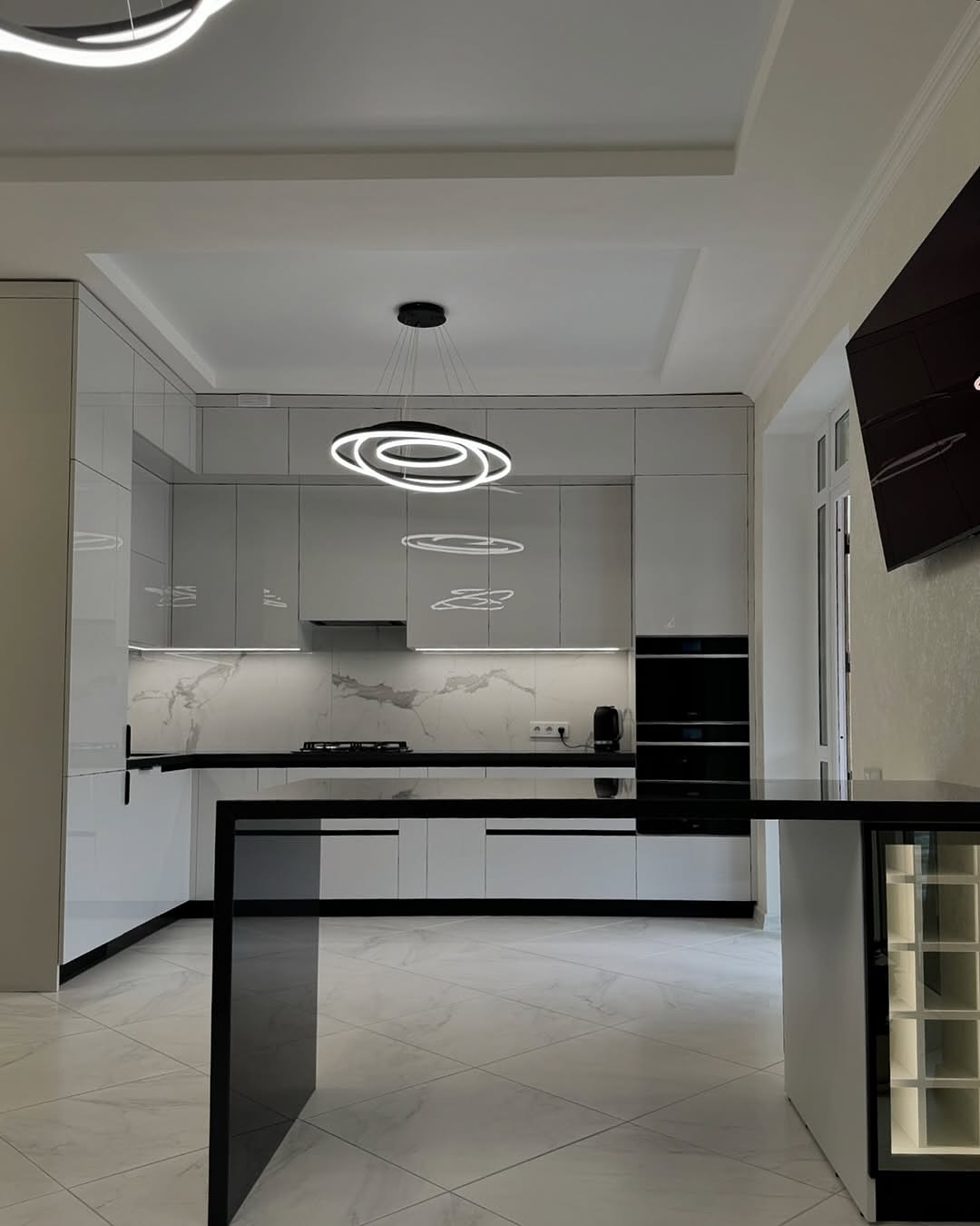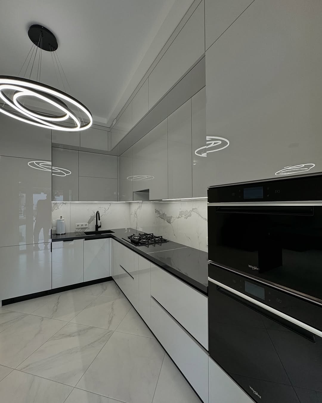 Угловая светлая кухня с глянцевыми фасадами в Днепре под ключ