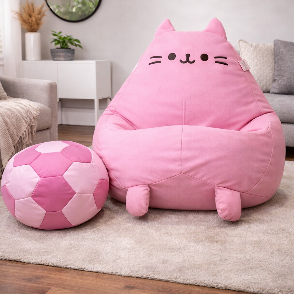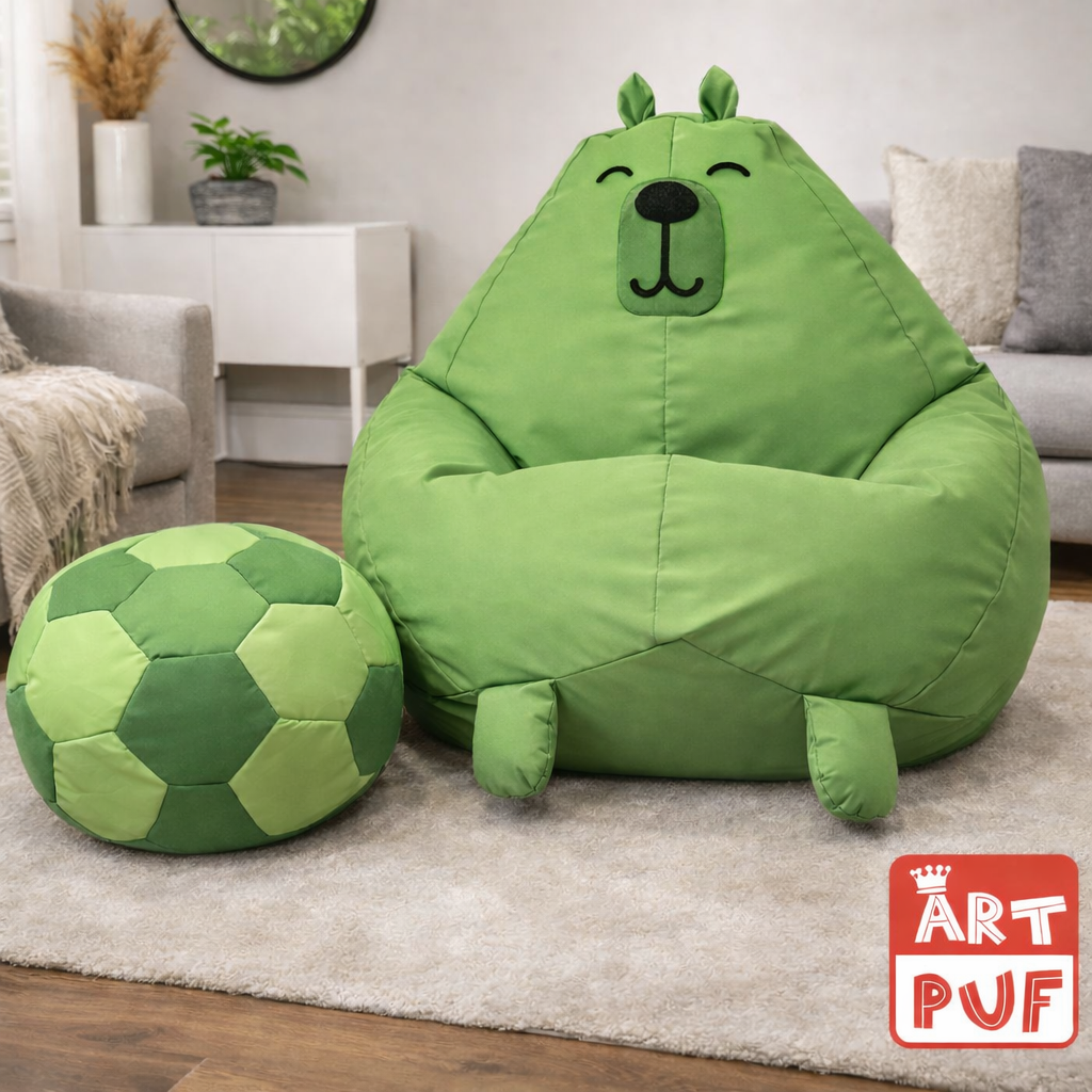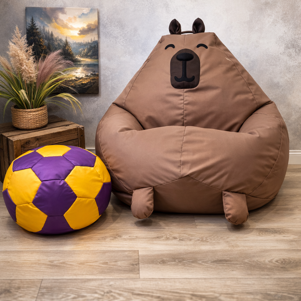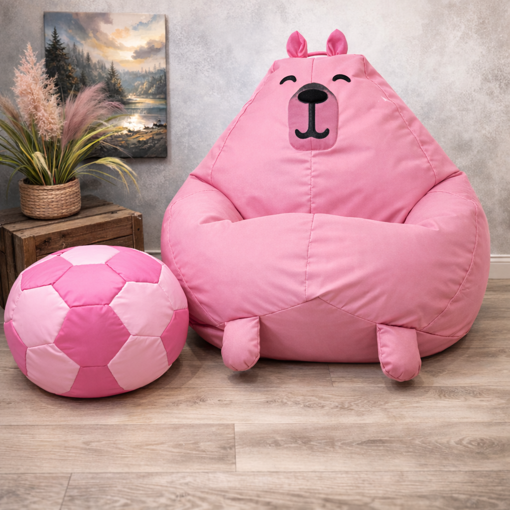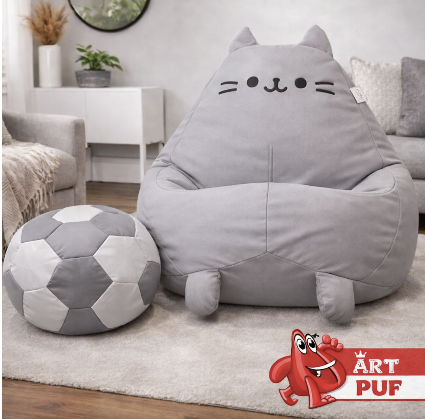 Один из самых оригинальных комплектов это кресло мешок груша в виде зайчика и небольшой мячик диаметром 30 см под ноги который отлично дополняет основное кресло при пошиве мы используем ткань оксфорд этот материал не боится влаги и сырости поэтому кресло можно брать с собой на природу и даже на пляж. Внутри кресла есть обязательно внутренний чехол который позволяет снять внешний постирать и снова использовать изделие.