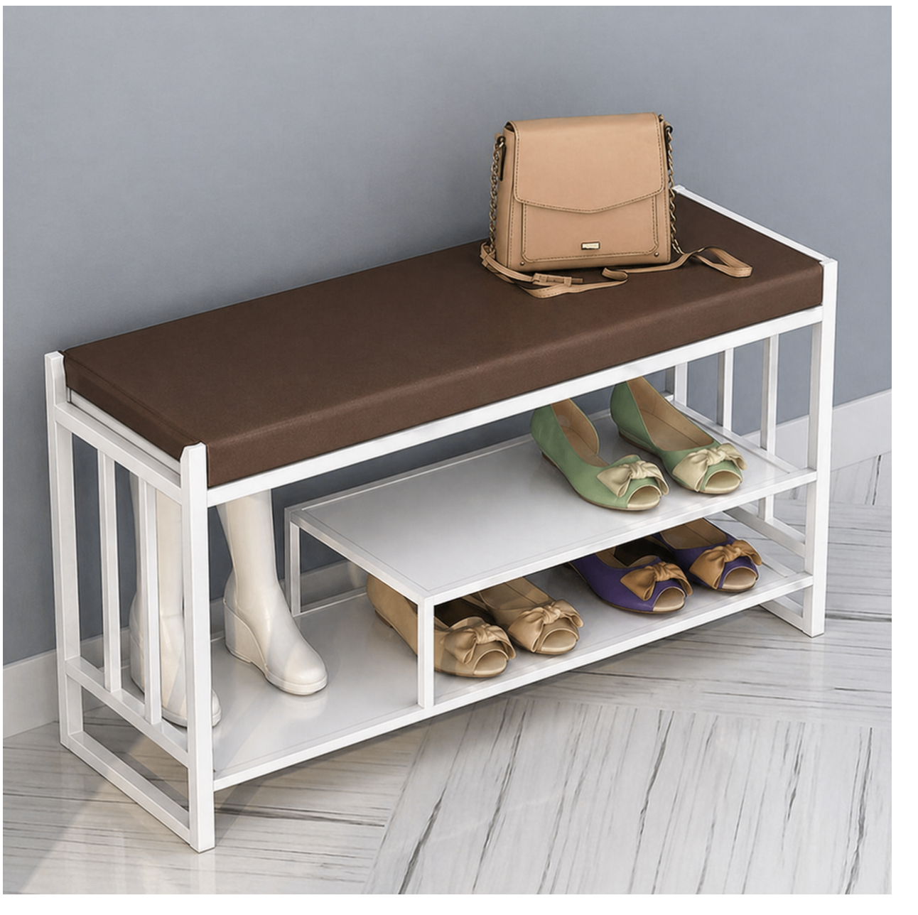 Металлический каркас белого цвета гарантирует прочность и устойчивость, а мягкое сиденье коричневого цвета выполнено из практичной ткани велюр, которая легко очищается и сохраняет привлекательный внешний вид. Банкетка гармонично впишется в интерьер в стиле минимализм, лофт, модерн или сканди. Наличие полок позволяет хранить обувь, тапочки или аксессуары, экономя пространство и поддерживая порядок. Это идеальное решение для квартиры, дома или офиса.