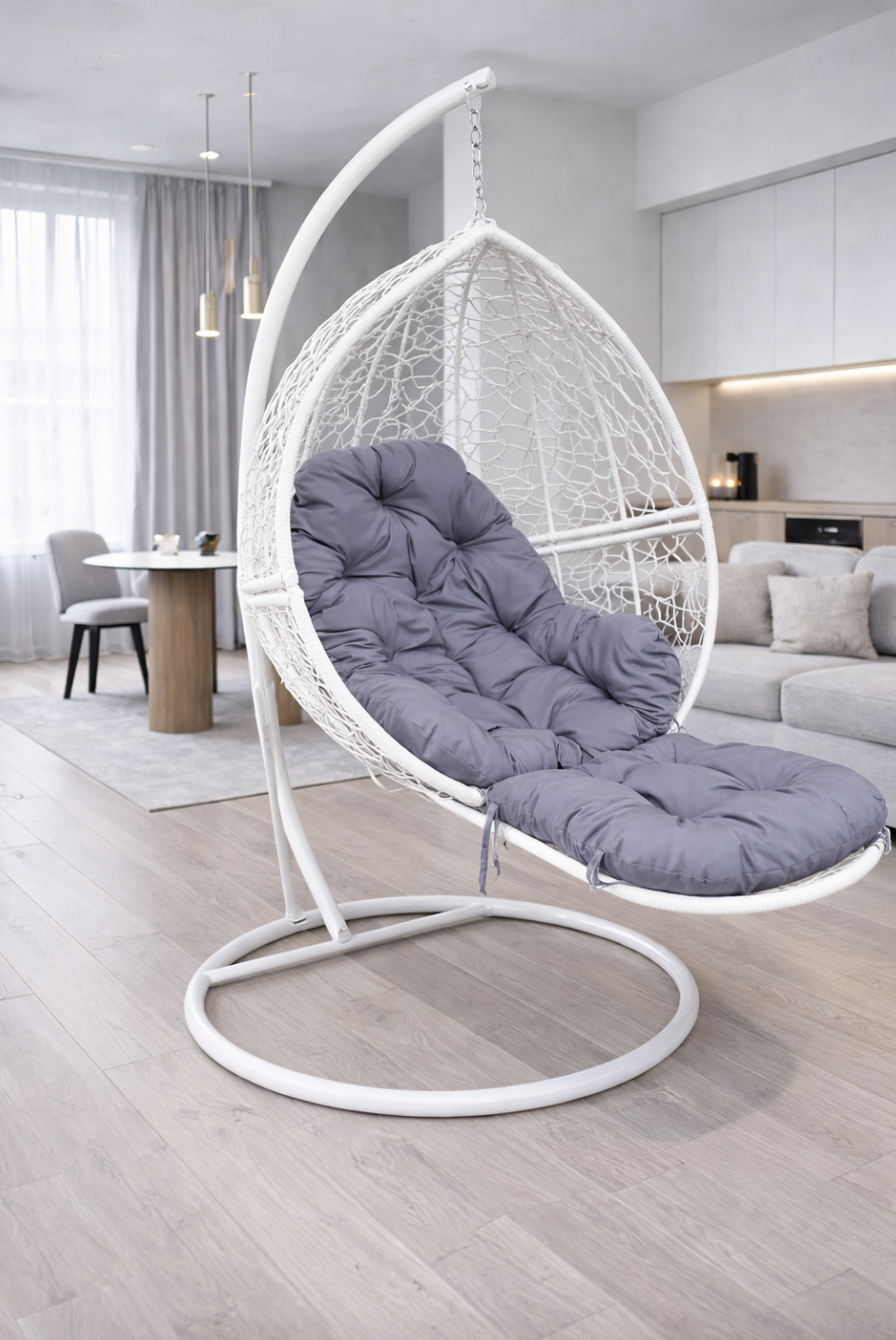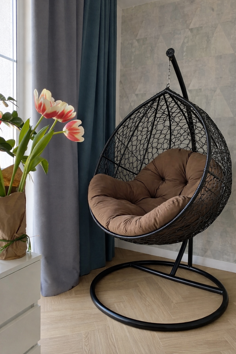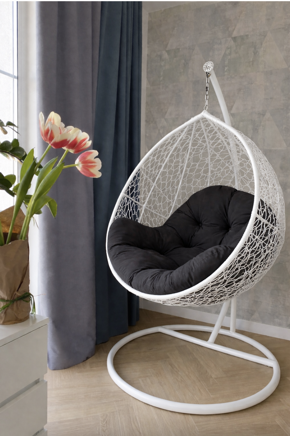 - Возможность использовать со стойкой и без очень полезно, если Вы хотите установить подвесное кресло кокон на балконе или в квартире, за счёт того что не используется стойка появляется свободное место.